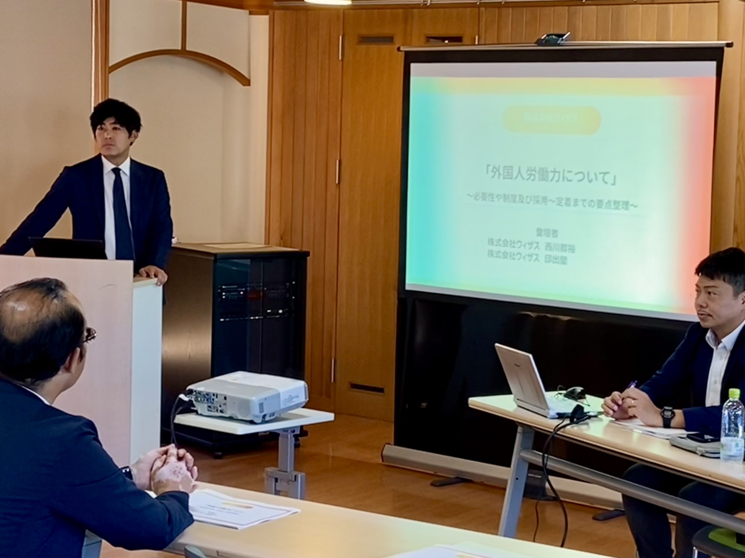 あわせて、同日開催された磐梯町主催の外国人採用説明会では、地元企業様に向けた「外国人採用基礎知識セミナー」を実施しました。日本で就労する外国人材の現状や在留資格の種類等について解説するとともに、実際に外国人材を受け入れている企業や就労中の外国人材の声も交え、具体的な事例をご紹介いたしました。また、個別相談会では、事業内容や従事する業務をお伺いしたうえで、それぞれの企業様に適した在留資格についてご案内し、外国人材の活用に向けた理解を深める機会を提供いたしました。